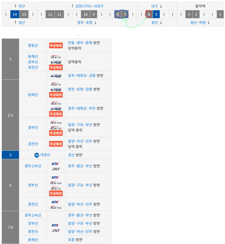 다만 서대구역에 정차하는 KTX는 동대구역 6번 타는 곳에 정차하므로 이 때는 내려서 7, 8번 타는 곳으로 이동해야 합니다.