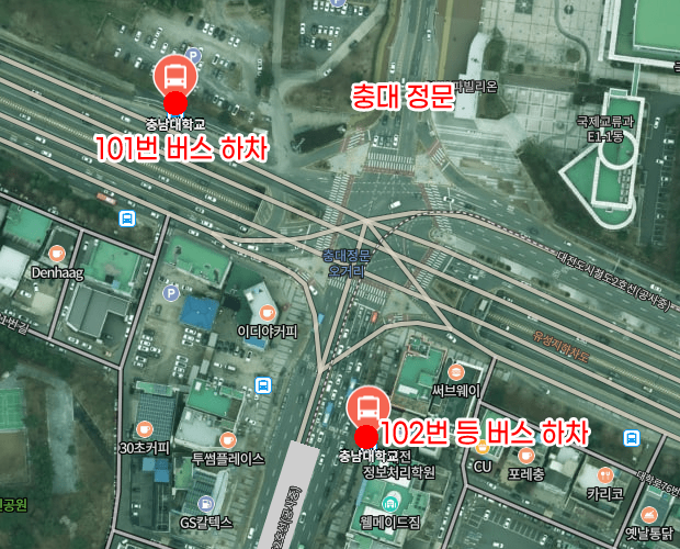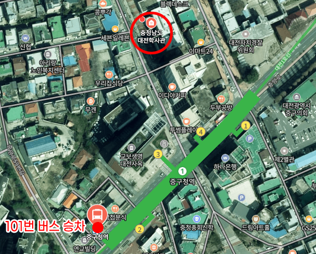 참고로 중구청역 정류장에서 101번 버스를 타고 19번째 정류장인 충남대학교 정류장에서 내리면 한 번에 이동 가능합니다.